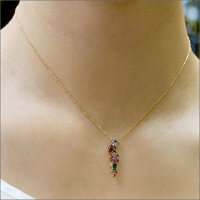 一つ一つのお花の形、葉っぱやつぼみをイメージした石枠のそれぞれが引き立つように高低差を付けて並べているので、胸元に着けた時には平面的なデザインのものよりも存在感を感じていただけます。