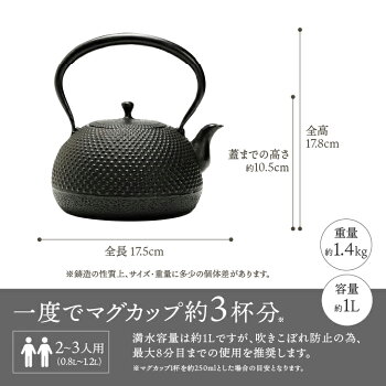 商品説明 名称 南部鉄器 鉄瓶 別製いがぐりあられ【伝統工芸士 佐藤圭 作】 製造 岩手県奥州市水沢産 南部鉄器 素材 本体:鋳鉄、持ち手:鋼材 サイズ 満水容量:約1L 使用人数目安:2~3人用(0.8L~1.2L) 注ぎ口を含む全長:約17.5cm 持ち手を含む全高:約17.8cm 蓋までの高さ:約10.5cm 底面直径:約13cm 重量:約1.4kg ※本体大きさや重量、容量は制作工程の都合上表記と若干誤差がある場合がございます。
