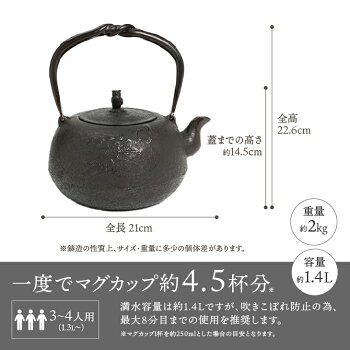 【お礼の品・配送に関するお問い合わせは、(水沢鋳物工業協同組合:0197-24-1551)までお願いします】 商品説明 名称 南部鉄器 鉄瓶 丸南部松(中)1.4L【佐藤勝芳 作】 製造 岩手県奥州市水沢産 南部鉄器 素材 本体:鋳鉄持ち手:鋼材 サイズ 満水容量:1.4L 使用人数目安:3~4人用(1.3L~) 注ぎ口を含む全長:約21cm 持ち手を含む全高:約22.6cm 蓋までの高さ:約14.5cm 底面直径:約11cm 重量:約2kg ※本体大きさや重量、容量は制作工程の都合上表記と若干誤差がある場合がございます。