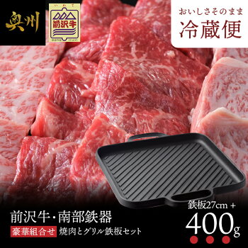 【ふるさと納税】 前沢牛・南部鉄器 焼肉とグリル鉄板セット 【奥州市産品の豪華組み合わせ】 (前沢牛上カルビ・肩ロース・モモ 計400g、南部鉄器鉄板27cm) 【冷蔵発送★お届け日指定をお忘れなく!】 ブランド牛 [U0129]