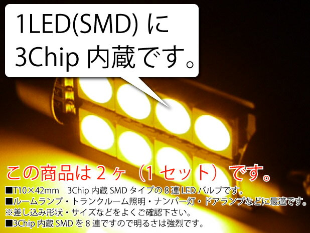 8連LEDルームランプT10×42mmアンバー2個 3ChipSMD LEDルームランプ 明るいLED ルームランプ 爆光LEDルームランプ as910-2