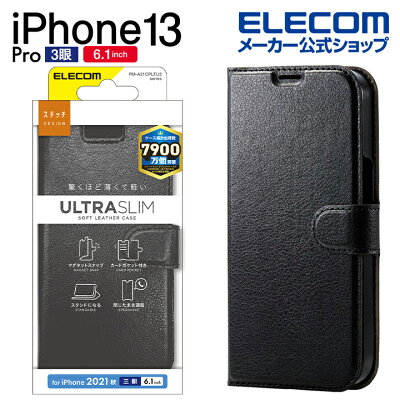 エレコム iPhone 13 Pro 6.1inch 3眼 用 ソフトレザーケース 薄型 磁石付 ステッチ 2021 アイフォン iphone13 6.1インチ 3眼 ソフトレザー ケース カバー 手帳型 UltraSlim ブラック PM-A21CPLFU2BK